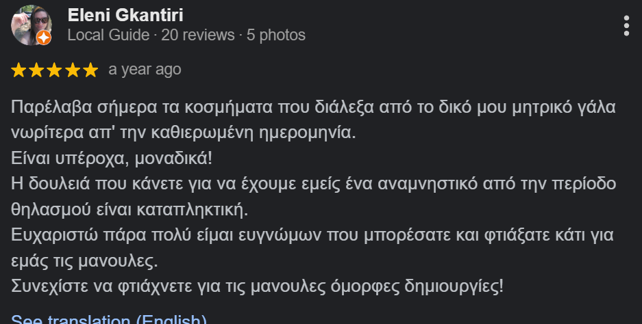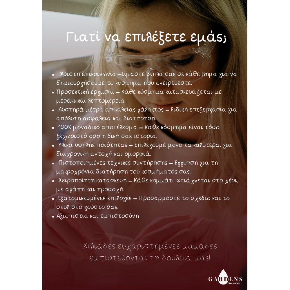 Με αγάπη, αφοσίωση και απόλυτο σεβασμό προς κάθε μητέρα, πατέρα και άνθρωπο που μας εμπιστεύεται, δημιουργούμε χειροποίητα κοσμήματα από Μητρικό γάλα, Μαλλάκια μωρού, την Νυφική ανθοδέσμη και άλλες πολύτιμες αναμνήσεις