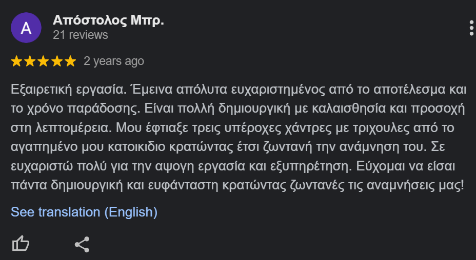Κάθε κόσμημα είναι μοναδικό, φτιαγμένο εξ ολοκλήρου στο χέρι με υλικά υψηλής ποιότητας. Κάθε φωτογραφία που βλέπετε στην ιστοσελίδα μας είναι αυθεντική, καθώς πιστεύουμε στην ειλικρίνεια, την εμπιστοσύνη και τον σεβασμό απέναντι σε κάθε οικογένεια που επιλέγει να μας εμπιστευτεί τις αναμνήσεις της.